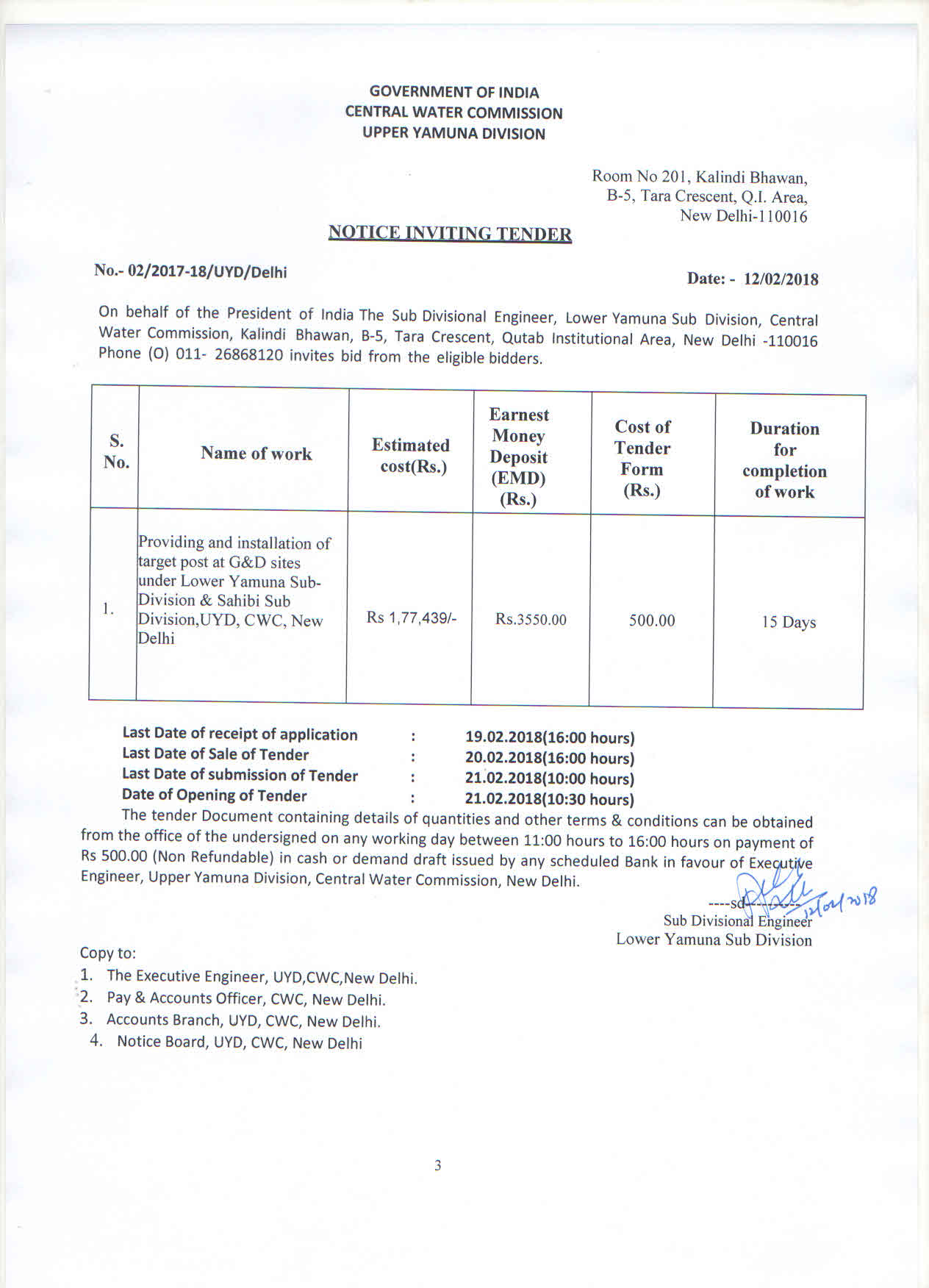 आउटसोर्सिंग बेसिस-सीडब्ल्यूसी दामोदर डिवीजन पर सुपरवाइजरी स्टाफ की भर्ती शुद्धिपत्र - निविदा लोअर यमुना सबडिविजन साहिब सब डिवीजन यूवायडी सीडब्ल्यूसी नई दिल्ली के तहत जीडी साइटों पर लक्ष्य पद प्रदान करना और स्थापित करना