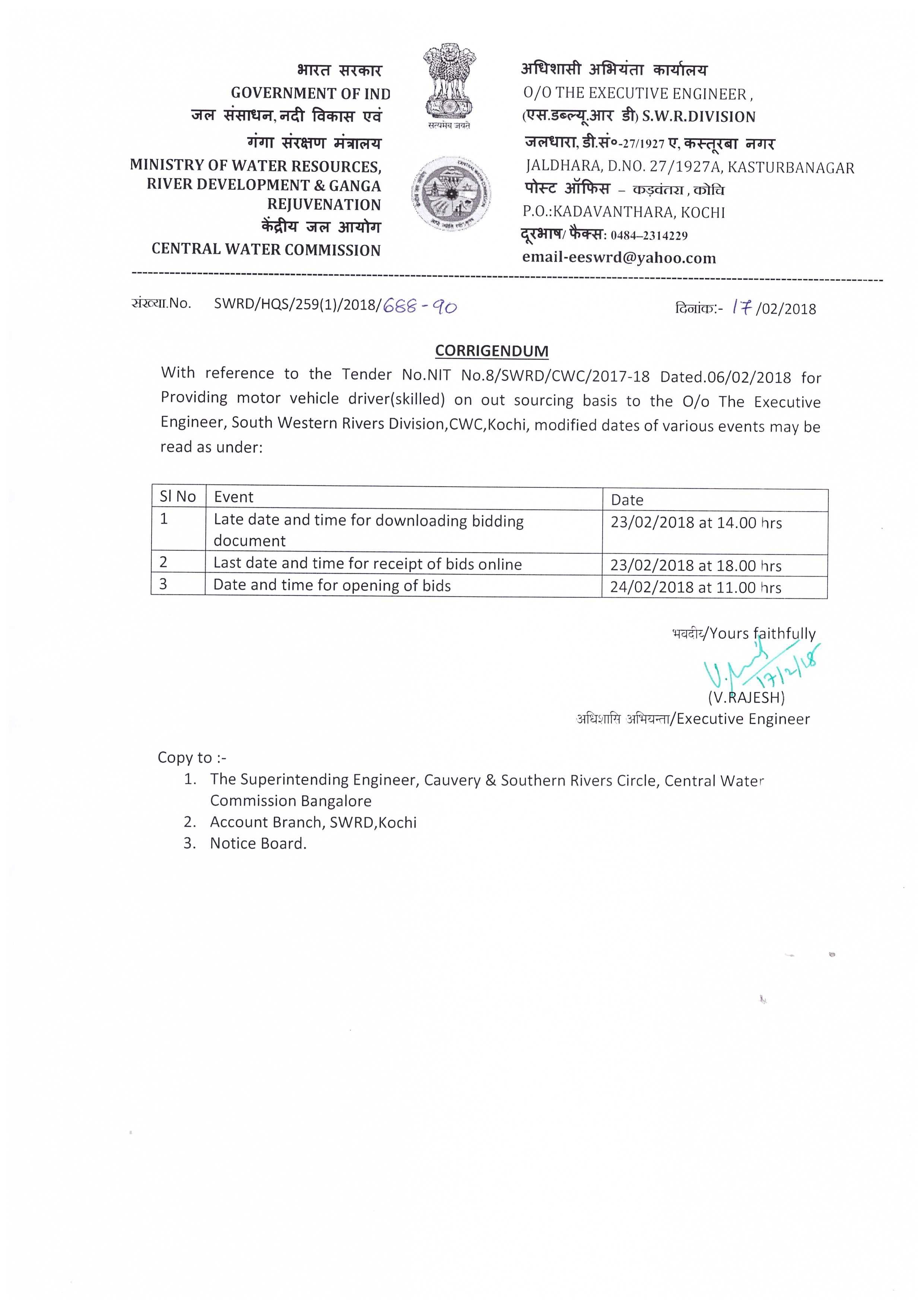 206 | 06/SWRD/CWC/ 2017-18 Dated 23/01/2018 |
